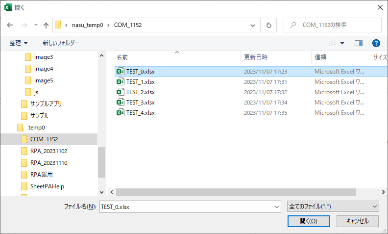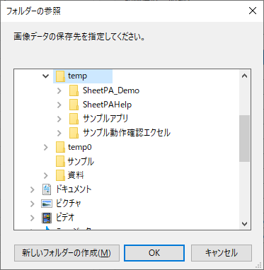 「シート追加」のクリックでExcelシートを追加しますが、操作記録に画像が含まれている場合、その画像のファイルとしての格納先の指定が表示されます。