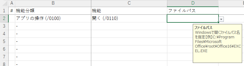 機能入力シートは、次の列を用意しています。