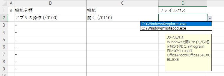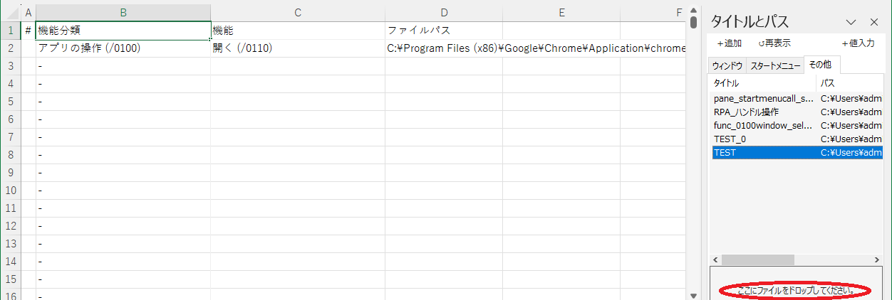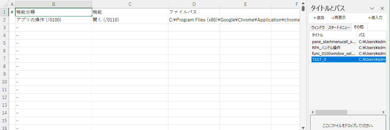 - +値入力ボタン:一覧で選択した”ウィンドウタイトル”、”ファイルパス名”を引数に貼り付けます。