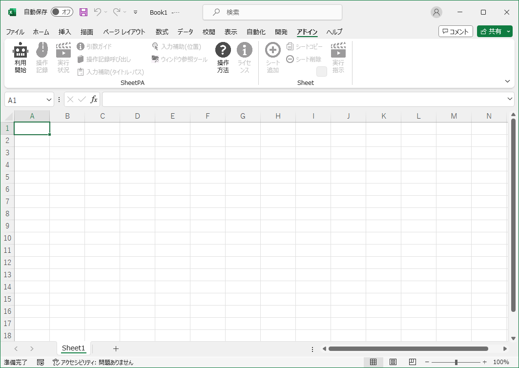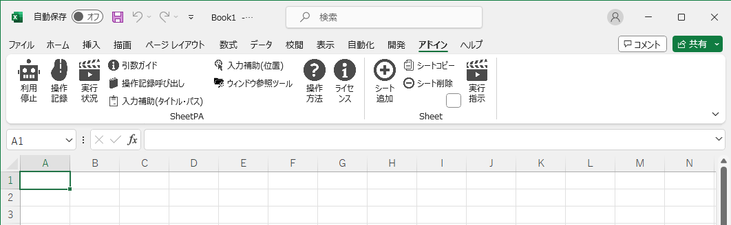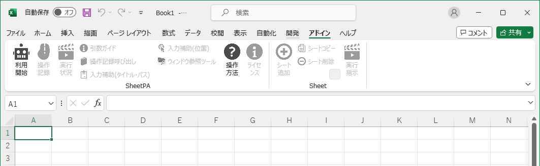 Excelファイルを開いた直後は、SheetPAの機能は全停止した状態です。