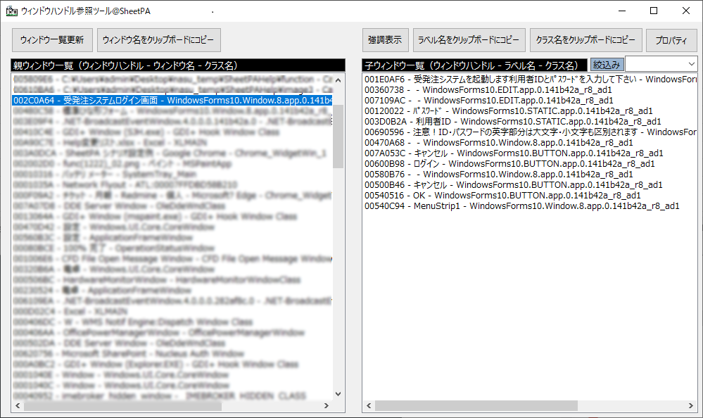 - ウィンドウ一覧更新 → 目的のアプリケーションの親ウィンドウ名をクリップボードにコピー → シートに貼り付け。