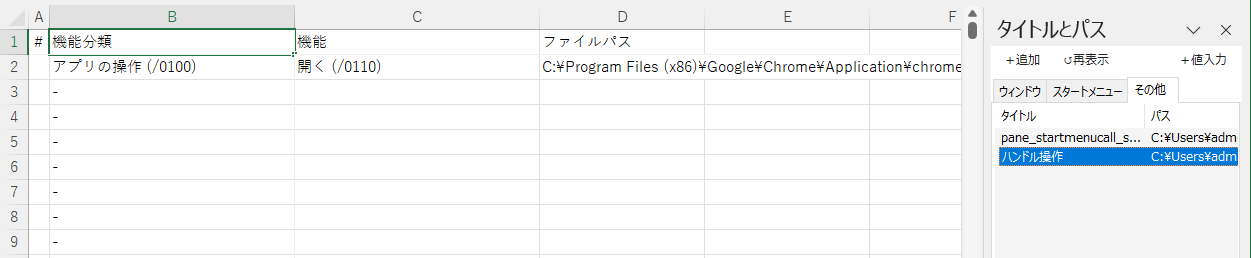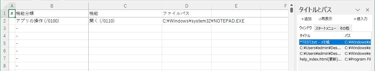 (ウィンドウの一覧から動作中のアプリを+値入力ボタン またはダブルクリックで選択しシートに貼り付けた状態)