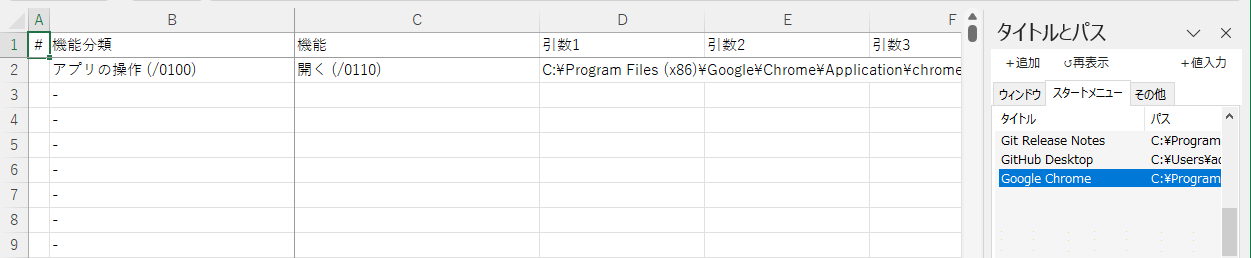 (スタートメニューの一覧からアプリを+値入力ボタン またはダブルクリックで選択しシートに貼り付けた状態)